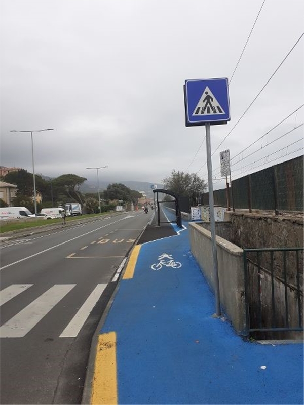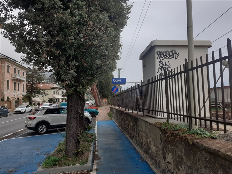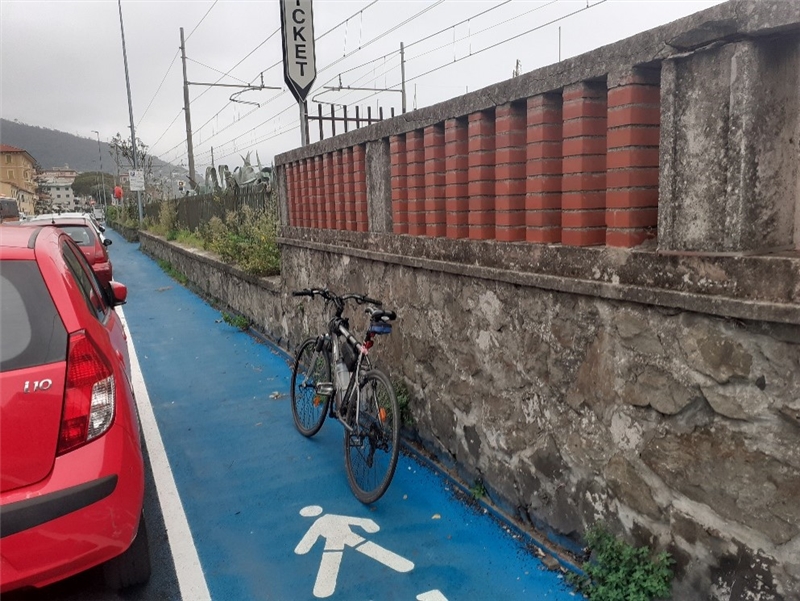 Lato Est la ciclabile si restringe ulteriormente in corrispondenza del termine della stessa in corrispondenza della Stazione di Cavi di Lavagna. Questa ciclabile sembra essere utile solo in caso di poco affollamento di altre bici o pedoni, quindi soprattutto in inverno o in periodi di scarso transito. Poco presenti anche i cicloposteggi, che si potrebbero accrescere sfruttando le numerose nicchie tra ciclabile e muraglione, in cui sono presenti pochissimi stalli. Considerando che tale ciclopedonale sarà utilizzata soprattutto in estate per recarsi agli stabilimenti, la presenza di cicloposteggi potrebbe essere molto utile.